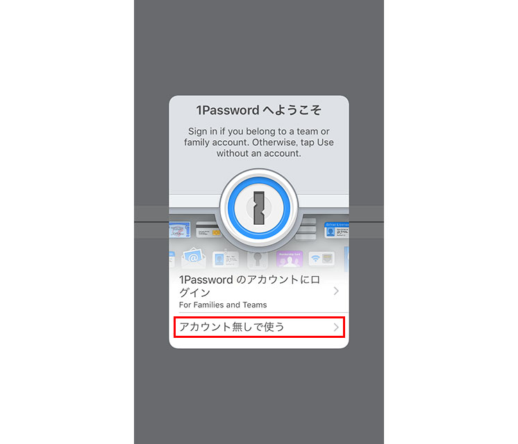 最初の画面では、「アカウント無しで使う」をタップ。「1Passwordのアカウントにログイン」は、有料のプロ版(詳細は後述)の機能となる。