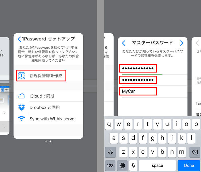 「新規保管庫を作成」をタップしてマスターパスワードを設定する