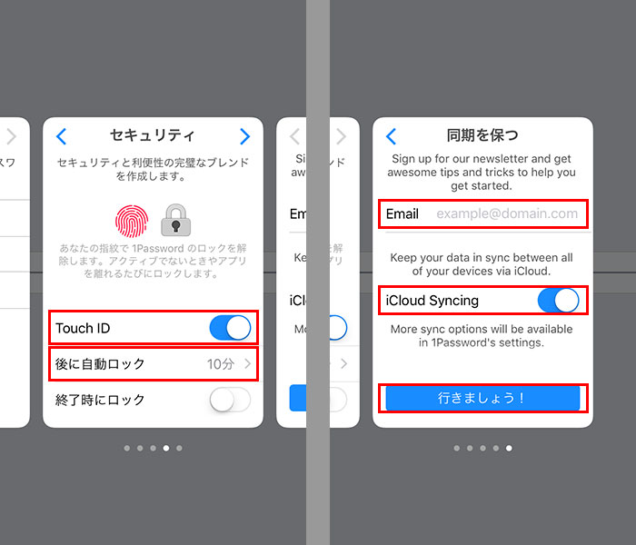 Touch ID対応のiPhoneの場合は、マスターパスワードを入力する代わりにTouch IDでロックを解除できる。利用する場合は「Touch ID」を有効にしよう。また、アプリをロックするまでの時間も設定しておく。「iCloud」で登録情報の同期を行うには、次の画面で「iCloud Syncing」を有効にすればいい。「Email」は、新しいニュースなどのお知らせメールを受け取りたいときに設定する。不要なら空欄のままで構わない。最後に「行きましょう!」をタップしたら初期設定は完了だ。
