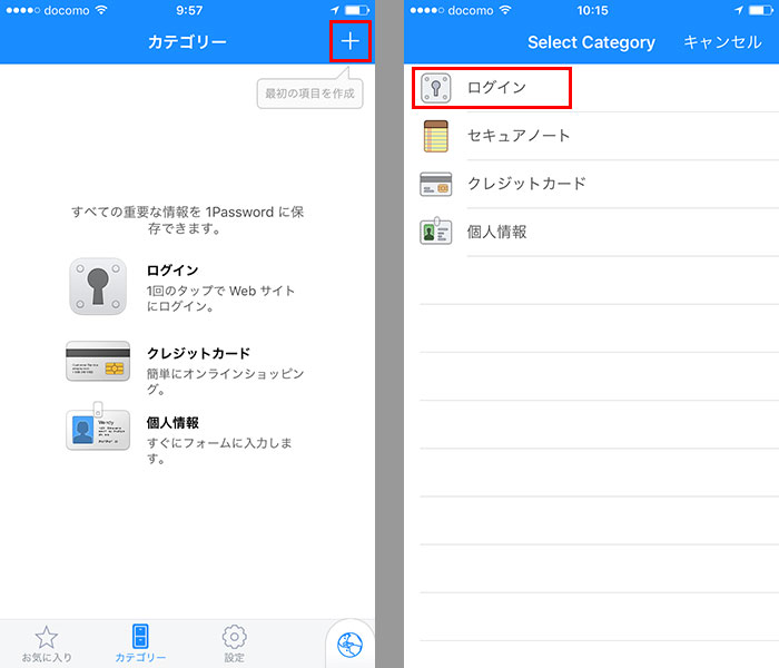 アプリ画面が開いたら画面下部の「カテゴリー」をタップし、次の画面で右上にある「+」をタップ。無料版では、IDとパスワードを保存する「ログイン」のほか、メモを保存する「セキュアノート」「クレジットカード」「個人情報」が登録できる。いずれも登録しておくと、該当のWebサイトで自動入力ができるようになる。ここではログイン情報を登録するので、「ログイン」をタップする。「クレジットカード」と「個人情報」も、必要な情報を入力するだけでいい。