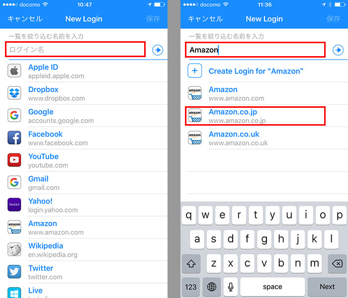 「New Login」の画面が開くと、あらかじめログイン画面のURLが登録されたサービスの一覧が表示される。登録したいサービスを一覧から探すか、「ログイン名」にサービス名を入力して検索する。ここでは「Amazon.co.jp」を例に解説するので「Amazon」と入力し、検索結果の「Amazon.co.jp」をタップする。