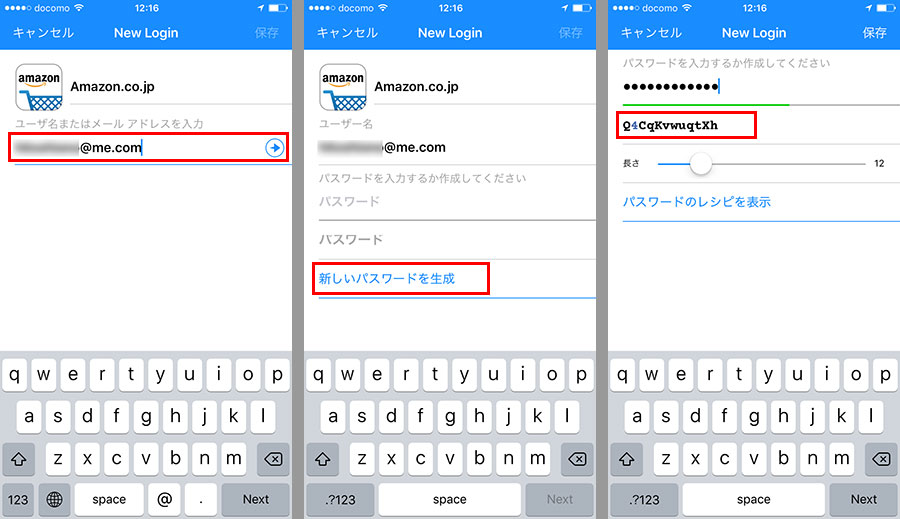 初めに、ログインに使うユーザー名またはメールアドレスを入力して「→」ボタンをタップ。次の画面で、パスワードを入力する。現在使っているパスワードをそのまま利用するなら、パスワードを2回入力すればいい。ここでは、新しく設定するので「新しいパスワードを生成」をタップ。自動でパスワードが作成される。このパスワードをメモし、該当サービスのサイトでパスワードを変更しておこう。最後に「保存」をタップする。