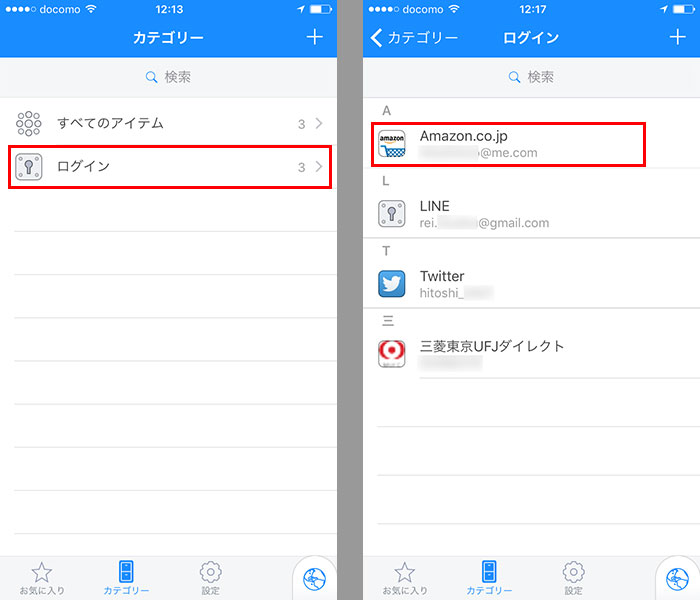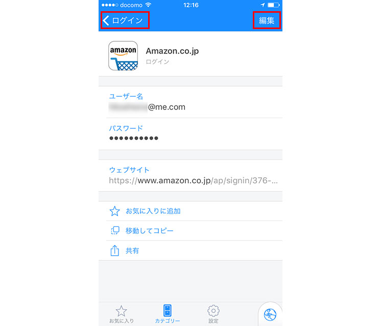 内蔵ブラウザーの場合は、「1Password」を起動して「カテゴリー」画面の「ログイン」をタップ。登録済みの項目が表示されるので、利用するサービスをタップする。ここでは、「Amazon.co.jp」にログインしてみよう。