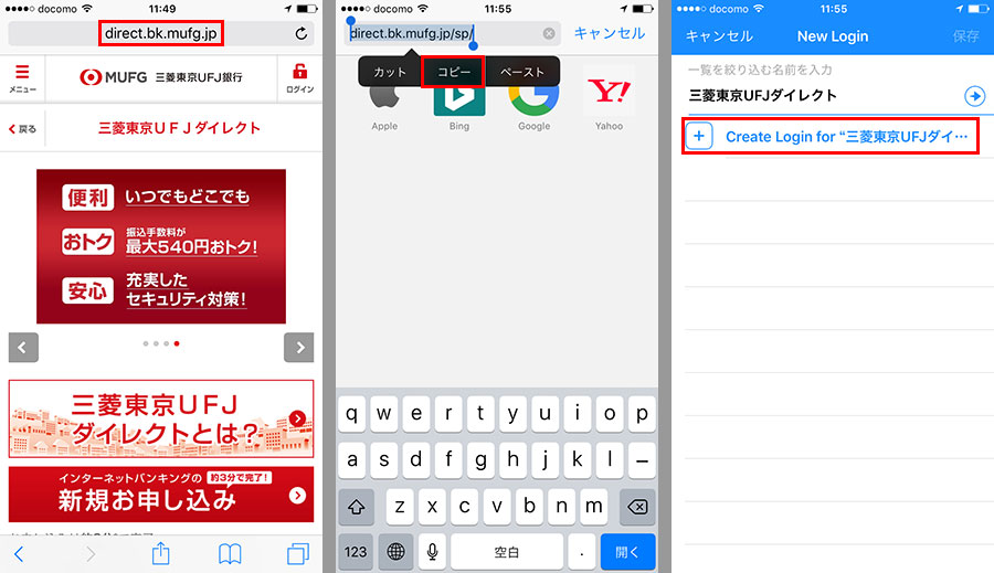 登録したいサービスがカテゴリー一覧に表示されない場合は、新たに項目を作成する。ここでは例として、「三菱東京UFJダイレクト」の項目を作成してみよう。あらかじめ「Safari」でログイン画面を表示し、URLをコピーしておくといい。コピーは、URL部をタップし、さらに長押しして表示されるメニューから「全選択」→「コピー」をタップする。「New Login」画面を開いたら、「三菱東京UFJダイレクト」と入力し、「Create Login for 〜」をタップしよう。