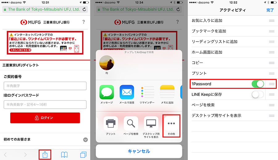 「Safari」を利用する場合は、「Safari」から「1Password」を呼び出して利用する。「Safari」で利用したいサービスのログイン画面を開き、画面下部中央の「共有」ボタンをタップ。メニューが開いたら、下段を左方向へスワイプして右端にある「その他」をタップ。開く画面で「1Password」を有効にする。