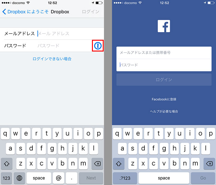自動ログインの対応/非対応はログイン画面で判断する。左は対応の「Dropbox」、右は非対応の「Facebook」だ