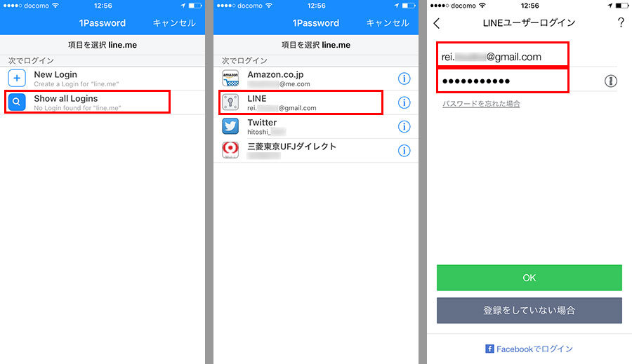 「1Password」画面が表示されるので、「Show all Logins」をタップ。登録しているログイン項目が一覧表示されるので、使いたい項目をタップ(ここでは「LINE」)。これでログイン画面に戻ると、ユーザーIDとパスワードが自動入力される。