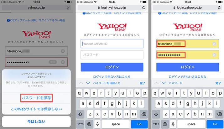 「Safari」では、初回ログイン時にパスワードを保存すると(左画面)、次回以降、ログイン画面を開けば自動でIDとパスワードが入力される(中と右画面)