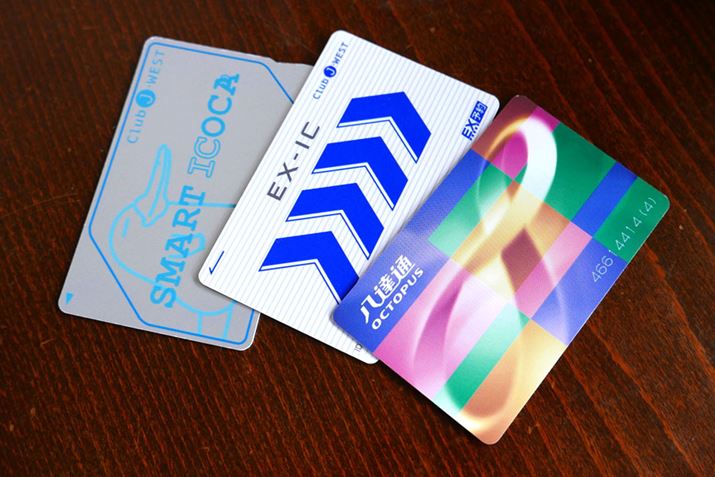 さまざまな交通系電子マネー(IC乗車券)。左から、JR系のSMART ICOCA、EX-ICカード、香港の公共交通機関で使えるオクトパス(八達通)カード