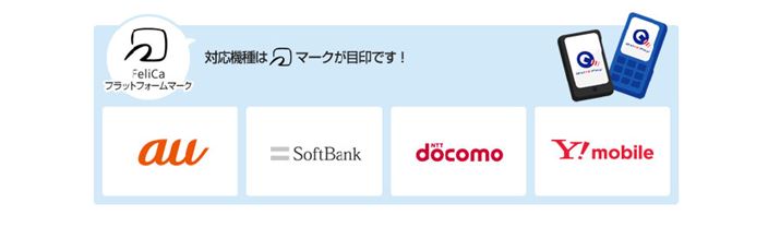 ポストペイ型であるQUICPayのモバイル版は、au、ソフトバンク、ドコモ、ワイモバイルの各主要キャリアに対応する(QUICPay公式サイトより)
