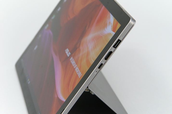 TransBook 3は、Surface Pro 4と本当によく似ている。スリムな本体、1024段階の筆圧検知に対応したスタイラスペン、背面のスタンド、専用端子に接続するカバー兼キーボードなど、似ている点を挙げるときりがないほどだ。本体はマグネシウム合金とアルミニウム合金を使った金属ボディで、剛性感は高い。厚さは約8.35mmとスリムだが、端を持ってもきしんだりすることはなかった。重量は約790gで、Surface Pro 4のCore i5/i7モデルよりも4gだけ重い。誤差の範囲で、両方を持ち比べてもその違いは感じられないはずだ。背面のスタンドもSurface Pro 4と同じく無段階で調整可能。少しだけ遊びがあるが、思い通りの位置でしっかりと固定できる。