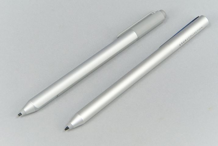 Surfaceペン(左)よりもASUS Pen(右)のほうがわずかに細い。ペンのお尻に消しゴム機能はないが、2つあるボタンに消しゴム機能が割り当てられており、ツールを使わずに線を消せる