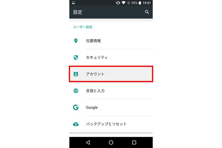 「設定」を開いて、「アカウント」をタップする。なお、今回は「Android 6.0」を搭載したスマホを利用している。搭載するOSによっては手順や画面が違う場合があるので注意してほしい