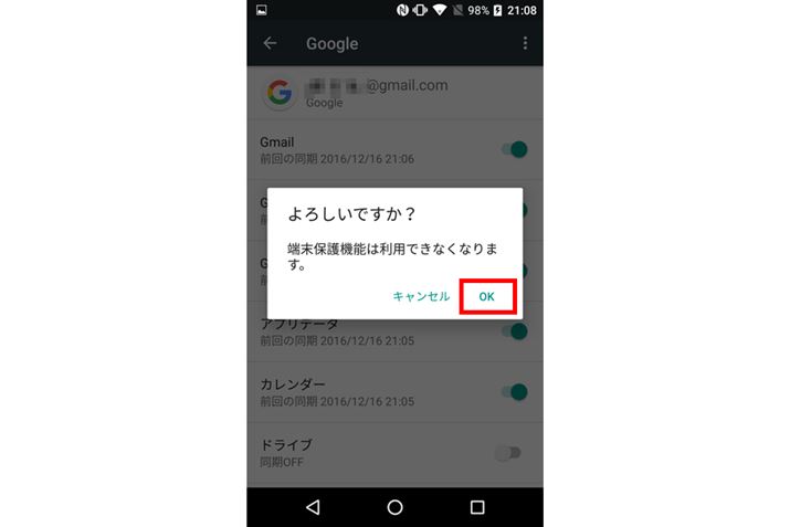 端末保護機能が設定されていると、それが利用できなくなるというメッセージが出る。アカウントを複数登録している場合は同じ手順でそれらも削除する