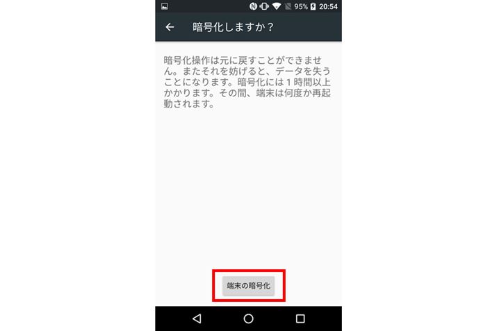 「端末の暗号化」ボタンをタップする。そうすると、再度確認メッセージが表示されるので、もう一度「端末の暗号化」をタップする