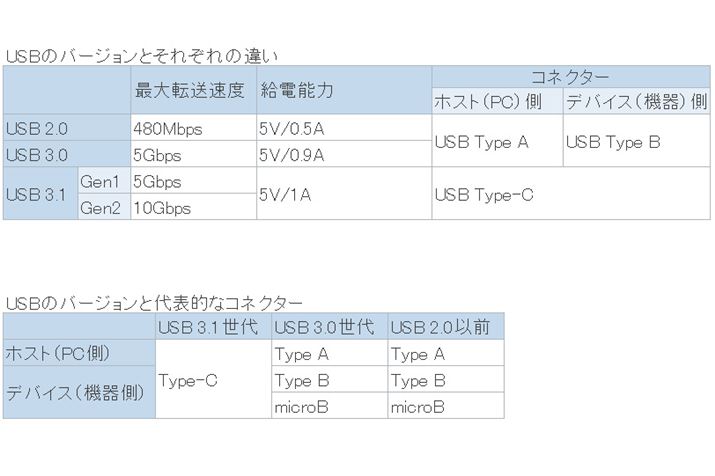 USB 3.1規格は、速度面だけでなく、給電能力も向上している。バスパワーはUSB 3.0の5V/900mAから5V/1Aに、またUSB PD時は最大5V/20Aまでサポート。コネクターは、USB 3.0以前ではホスト(パソコン)側が長方形状のUSB Type Aコネクター、デバイス(機器)側がUSB Type Bコネクターと決められていたが、USB 3.1世代ではUSB Type-Cに統一されている