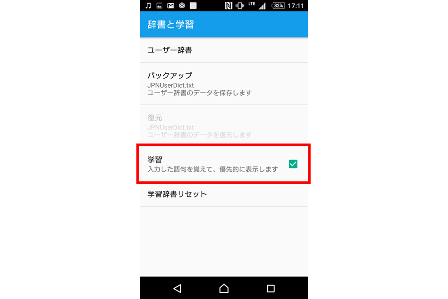 このアプリでは、「学習」と「学習辞書リセット」が設定項目だ。まず「学習」をタップしてチェックを外す