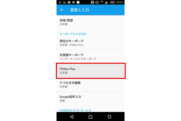 「言語と入力」を開いたら、使っている日本語入力アプリ(ここでは「POBox Plus」)をタップして設定画面を開く
