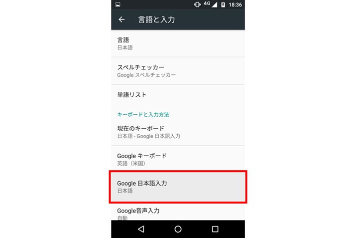 「言語と入力」を開いたら、使っている日本語入力アプリ(ここでは「Google 日本語入力」)をタップして設定画面を開く