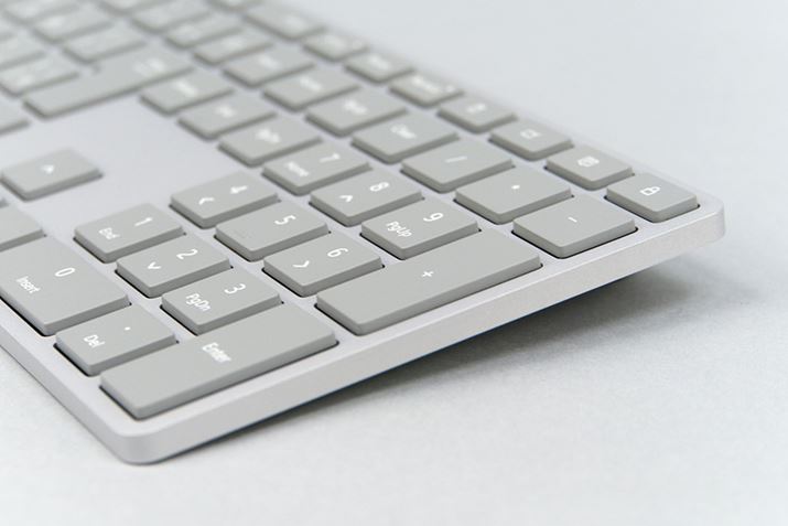 まずはSurfaceキーボードから見ていきたい。日本語配列のオーソドックスな、テンキー付きのキーボードだ。カラーは2in1タブレット「Surface Pro 4」や「Surface Book」と同じシルバーで、キーはグレー。装飾などは一切なく、Surfaceシリーズとマッチするシンプルなデザインに仕上げられている。素材は金属に見えるが、樹脂素材で見た目よりもずっと軽い。キーはさらっとした手触りで、指紋も付きにくかった。Bluetooth接続で、Windows 10/8.1/8やMac OS X v10.10.5/10.11.1および10.11.4で利用できる。Windows 10 PhoneやAndroid 4.4.2〜5.0(6.0でも動作することを確認)、iOS 8.1〜9.2.1(10.2でも動作することを確認)でも使える。ただし、複数の機器を登録しておけるマルチペアリングには対応しておらず、この点は少々残念だ。