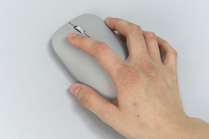 マウスの表面はサラッとした仕上がりで、強めにクリックしてもがたつかない。本体サイズは64.16(幅)×115.16(奥行)×33.76(高さ)mmで、小さすぎず、大きすぎずといったところ。重量も90.9gと軽すぎず、重すぎず。クリック音は静かで、軽いタッチでクリックできる。ただ、金属製のスクロールホイールがやや重く、頻繁にスクロール操作をするような作業には向かないかもしれない。こちらも電源は単4形電池2本を使用し、電池寿命は最長1年。
