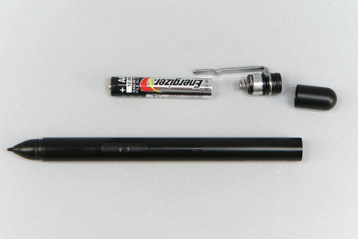 アクティブ静電結合方式のアクティブ静電ペン。単6形電池1本を使用する。ペン先のキャップはペンの逆側にはめられる。ペン先は1mmと極細