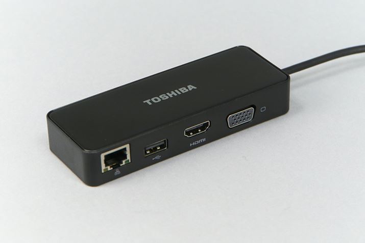 付属のUSB Type-Cアダプター。有線LAN、USB3.0、HDMI、RGB出力を備える。裏面にはUSB Type-Cを装備しており、USB Type-Cアダプターを接続したまま充電できる仕様だ
