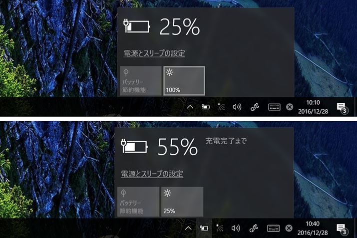 「お急ぎ30分チャージ」という急速充電を搭載。公称の数値はバッテリー残量が0%の状態から充電した場合の数値だが、バッテリー残量が25%の状態から30分充電したところ、55%まで充電された
