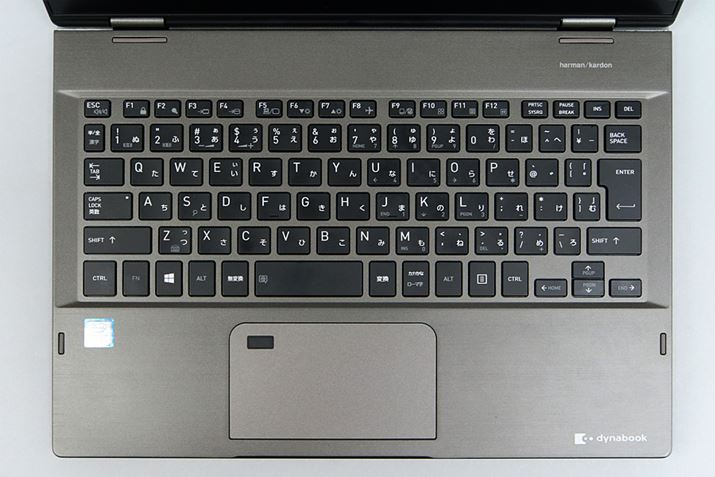 ボディはマグネシウム合金製で、カラーは「オニキスメタリック」という金属調のグレー。東芝の薄型モバイルノートの定番カラーだ。高級感はないが、道具として飽きずに長く使えそうな印象を受けた。手にすると、見た目よりもずっと軽く感じられる。360度回転するディスプレイのヒンジも絶妙な力加減で、好みの場所でしっかりと止まってくれる。タッチ操作にもすばやく反応し、ストレスなくスムーズに操作できる。指紋が付きにくく、見やすいノングレア(非光沢)液晶なのもポイントだ。