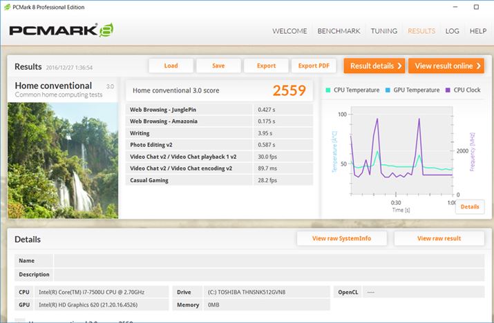 パソコンの総合性能を測定するベンチマークソフト「PC Mark 8 Professional Edition」(Futuremark)の結果。2in1パソコンとしては優秀なスコアだ