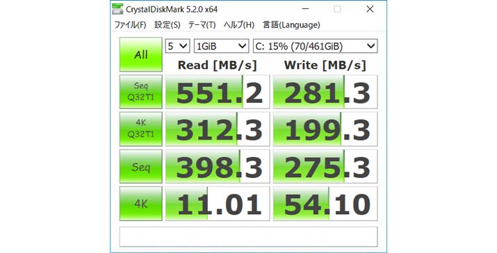 「CrystalDiskMark 5.2.0 x64」(ひよひよ氏作)の結果。PCI Express接続のSSDを搭載する他社モデルに比べると、読み書きスピードは劣る