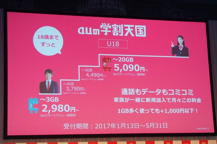 例年、この時期のキャリアの発表会は新生活需要に合わせて“学割”の発表がメインとなるが、今回のauもまさに学割の発表がメインだった。ご存知の方もいるかもしれないが、auは大手キャリアで初めて学割を提供した会社だ。2016年の学割は、若者のデータニーズの高まりを受けて加入時から25歳まで毎月5GBのデータ通信量をプレゼントするという内容で、料金の値下げというよりかはデータ容量の増量を強く意識した形だったため、データ通信をあまり使わない人にとっては割安感があまり感じられないものだった。