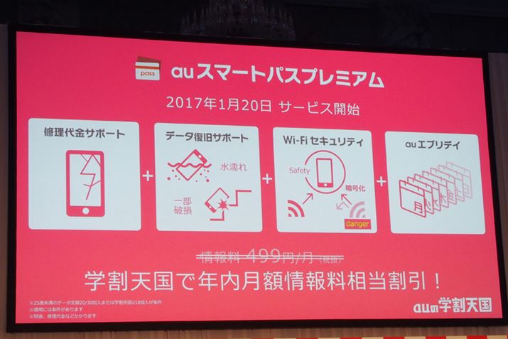 1月20日から提供を開始する「auスマートパスプレミアム」。月額税別499円の月額課金制のサービスだが、学割対象ユーザーは2017年12月まで月額利用料相当が割引される特典がつく