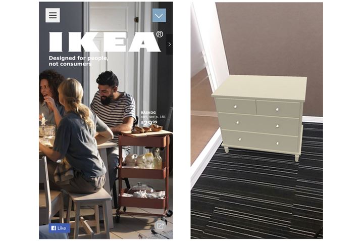 家具を購入するときは、寸法の確認が面倒だったり、室内と家具の外観のマッチングが気になったりするものだ。AR技術を利用すれば、そんな迷いも一気に解決できる。スマホアプリ「IKEAカタログ」は、室内にスマホのカメラをかざすと、画面にCGの家具が現れて、部屋に設置した場合のイメージを確認できるというもの。アプリ内には、IKEAのカタログに掲載されている膨大な家具の3Dデータが入っている。印刷されたIKEAのカタログがあれば、その表紙がマーカー(基準)となって、サイズも正しく表示される。