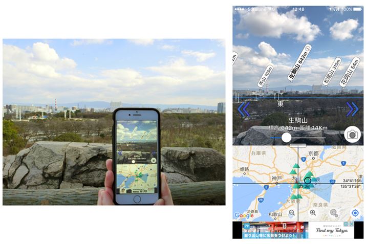 山が見渡せる場所で利用すると、スマホ画面内にカメラでとらえた風景が現れ、山の名前が現れる。まるで風景にタグを付けたような感覚が面白い。右はスマホ画面のキャプチャ画像例。風景の山に名前のタグが現れ、高さや距離などの情報も得られる(iOS版はこちら)