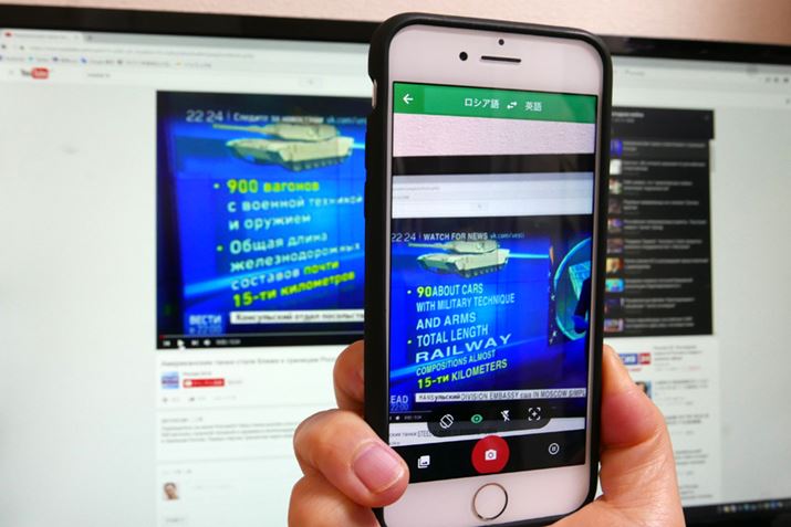 YouTubeで、とあるロシアのニュースサイトの配信動画を視聴。知らない言語でまったく見当がつかない内容でも、英語に変換してくれればある程度理解できる。アートワークやレイアウトがそのままで文字だけ置き換わるのも美点。ARの特徴を生かした本アプリならではの特徴だ