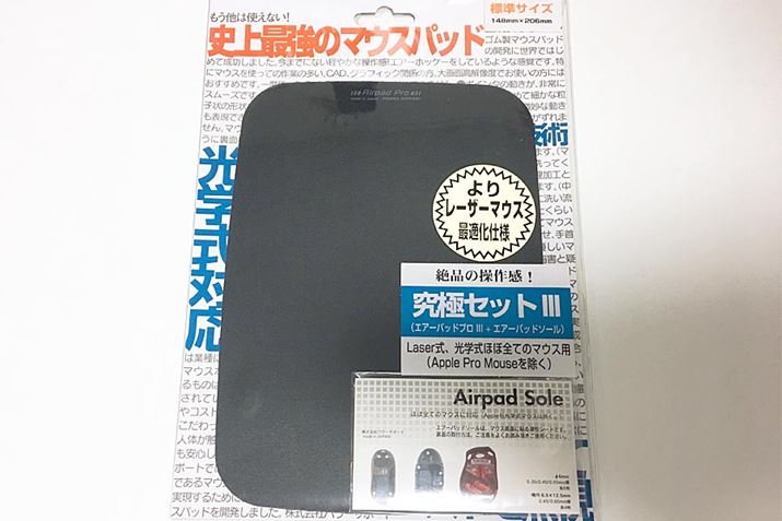 ここらで「マウスパッド難民」状態に終止符を打とうと製品を探していたところ、「史上最強のマウスパッド」「もうほかは使えない」「エアーホッケーのような操作感」などとあおりまくってくる製品を見つけました。パワーサポート社製の「エアーパッドプロIII」です。今回はマウスパッドにくわえてマウス用の滑性シートもセットになった「究極セットIII」を買ってみました。