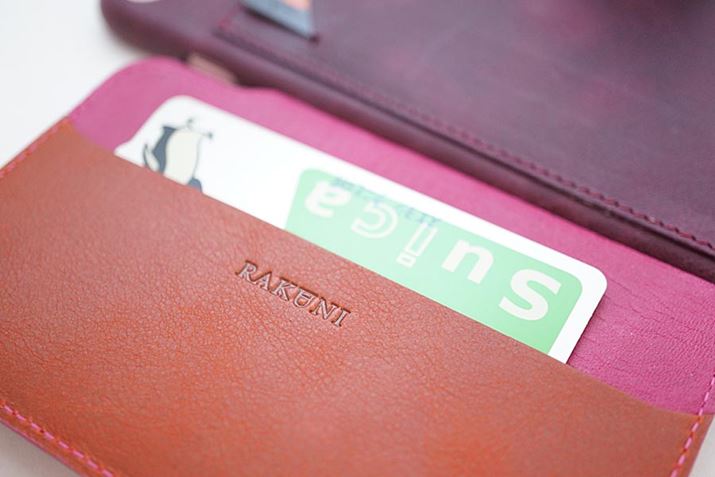 カードホルダーにはSuicaなどのICカードがオススメ。iPhoneをタッチするだけで決済が完了します。「RAKUNI」の刻印もイイ感じ