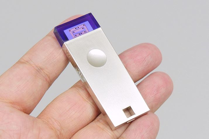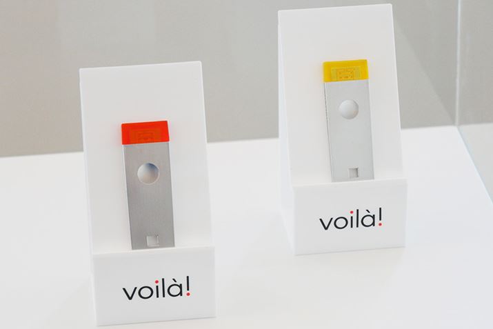 2月1日から発売されるスティック型の「voilà!(ヴォアラ!)」。本体サイズは23(幅)×62(高さ)×6(奥行)mmで、重量は11g。カギなどに付けて使うことを想定している