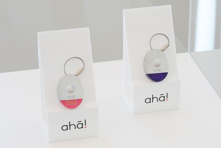 3月24日から発売されるペンダント型の「aha!(アッハ!)」。本体サイズは29(幅)×39(高さ)×9(奥行)mmで、重量は11g。カバンなどにもつけやすいデザインだ