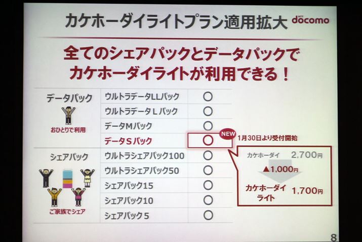 NTTドコモは、既存の料金プラン「カケホーダイ&パケあえる」の見直しを行い、従来は不可能だった「カケホーダイライトプラン(スマホ/タブ)」と単身者向けの月間2GBのデータパック「データSパック(小容量)」の組み合わせを追加。2017年1月30日より受付を開始する。これにより、「カケホーダイライトプラン(スマホ/タブ)」が、すべてのシェアパックおよびデータパックに対応することになった。