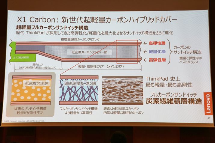 カーボンファイバー素材を使ったカバー(天板)の構造も一新している。これまではカーボン板をガラス繊維樹脂でぐるりと囲む構造だったが、樹脂の収縮する性質のため、反りや歪みが発生するという課題があった。新モデルでは、アンテナ窓を除くすべてをカーボン化し、接合用とフレーム構造用のガラス繊維樹脂を別々にすることで、金属切削並みの低反りを実現した。また、カーボン板自体も、これまではカーボン製の高弾性層で低密度発泡体を挟むサンドイッチ構造だったが、低密度発泡体を超低密度カーボン網に変えることで、さらなる軽量化と高剛性化を実現。強度を高めつつ、カバー単体では20gほど軽くなっているという。