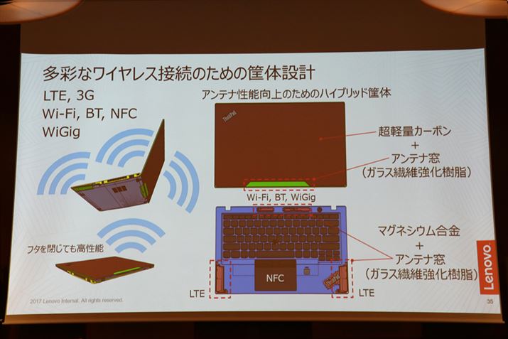 これまでディスプレイの額縁に配置していたアンテナを狭額縁化にともない、キーボード側に移動している。ただ移動させるだけでなく、アンテナ部分にガラス繊維強化樹脂を使用することで、従来モデルと変わらないアンテナ性能を確保したという。Wi-Fi、Bluetooth、NFC、WiGig、LTEなど、多彩な無線接続をサポートするのもポイント。オプションで選べるLTEのアンテナは、日本、米国、ドイツにて、徒歩、電車、バスの移動を含め2500カ所以上で検証テストを実施し、アンテナの性能の安定性を確認したという。