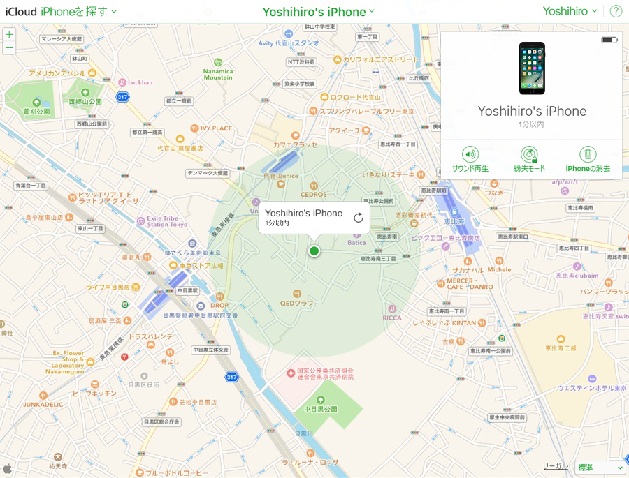 地図上でiPhoneの位置情報を確認できる。画面の右上で「サウンド再生」「紛失モード」「iPhoneの消去」を実行できる