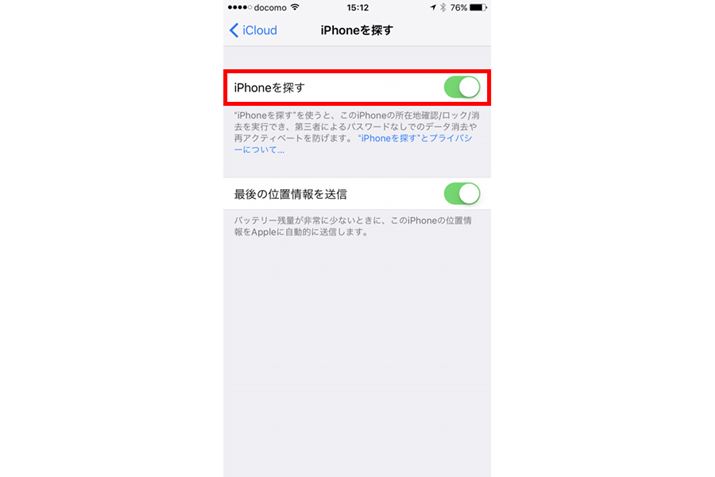「iPhoneを探す」をオン(有効)にして設定は完了。下の「最後の位置情報を送信」は、バッテリー残量が少ないときに、位置情報をアップルに送信する機能。少しでも見つかる可能性を高めるために、一緒にオンにしておくといいだろう