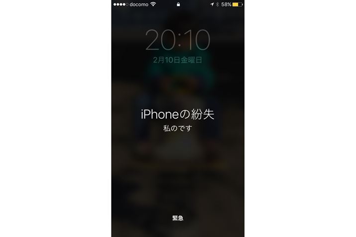 「紛失モード」を実行すると、iPhoneのロック画面にメッセージが表示される。拾得者に連絡先などを教えられる