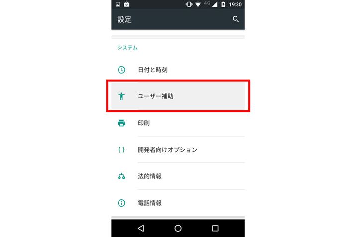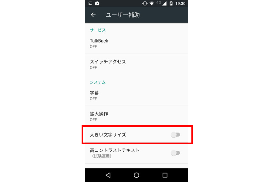 「ユーザー補助」で設定することもできる。この場合は大きい文字サイズと標準サイズの2段階の切り替えになる。「大きい文字サイズ」は「極大」相当だ。