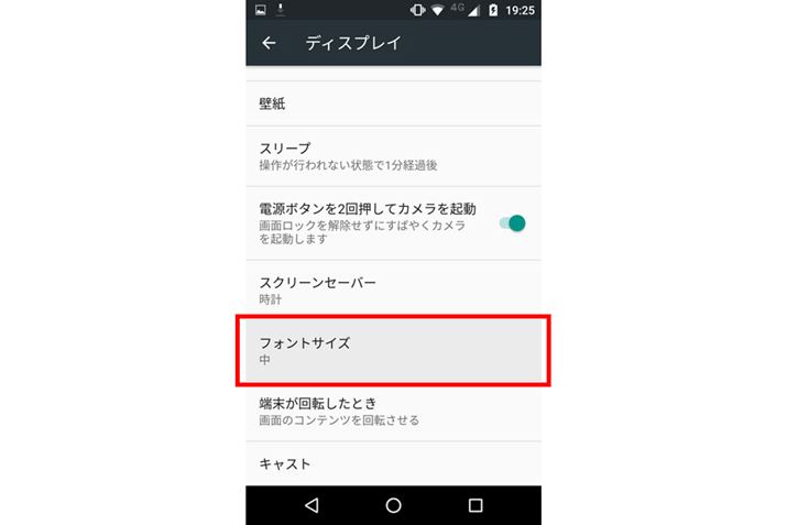 「画面設定」が開いたら下にスクロールして、「フォントサイズ」をタップする。あとは一般的なAndroid 6.0の場合と同様に、フォントサイズを選択する