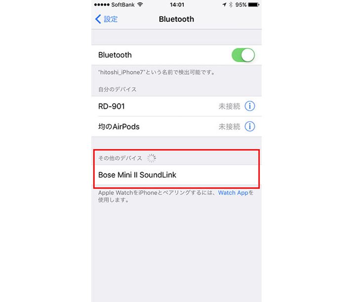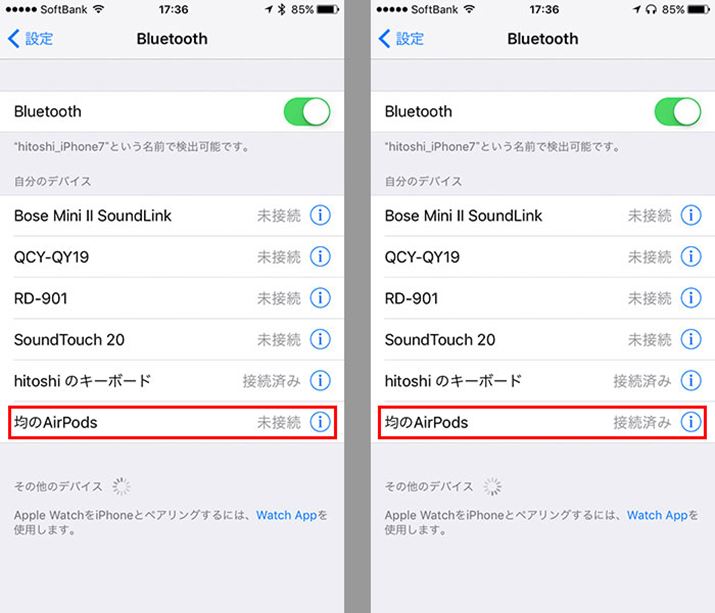 ペアリングが完了すると、iPhoneは「自分のデバイス」欄、Androidスマートフォンは「ペアリングされたデバイス」欄に機器名が表示され、利用できるようになる。なお、ペアリングは初回の接続時にのみ必要な作業で、次回以降は自動接続される。