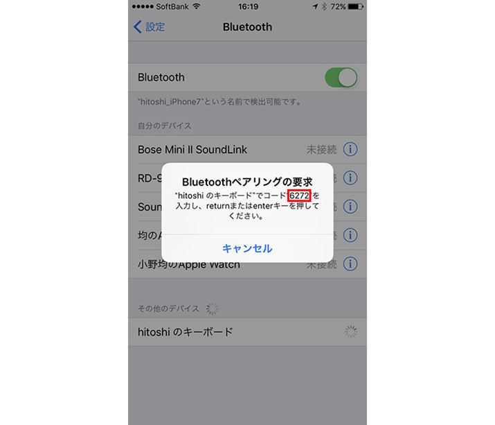 iPhoneにBluetoothキーボードを接続する例。表示される4桁のコードをキーボードから入力して「Enter」キーを押す